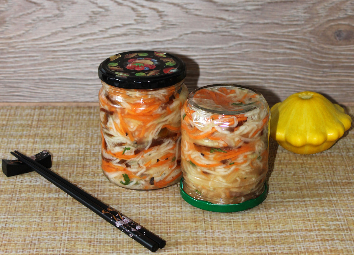 Эта закуска способна храниться до одного года, однако, с таким вкусом, вряд ли она доживет до следующего лета. Патиссоны по-корейски — это яркое дополнение к любому столу, которое приятно удивит и порадует всех.