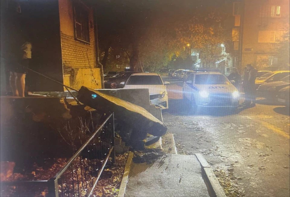 Машина снесла бетонный бортик и уронила его на ведущие в подъезд ступеньки. Как это произошло, никто не успел заметить. Автомобиль после удара остался на ходу, и водитель поспешил уехать с места происшествия.