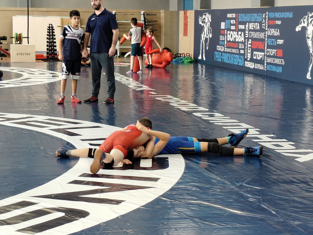 Вопреки названию, "ковер" очень тугой и плотный, мягким его не назовешь. Борцы приземляются на него с оглушительным ударами. "Это же борцы, они из другого теста", - успокаивают тренеры. Одновременно занимается около 30 ребят. Некоторые бросают друг друга, кто-то пока тренируется на кожаных манекенах.