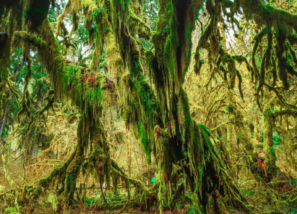 Первым в этом необычном путешествии выступает дождевой лес в штате Вашингтон. На его территории, в долине реки Квинлот, царит высочайшая влажность и постоянные дожди, создающие идеальные условия для множества мхов и лишайников. Эти зеленые ковры покрывают все вокруг — деревья, камни и даже тропинки. Попадая сюда, невозможно не ощутить, будто оказался в настоящем сказочном царстве, где зелень правит балом.