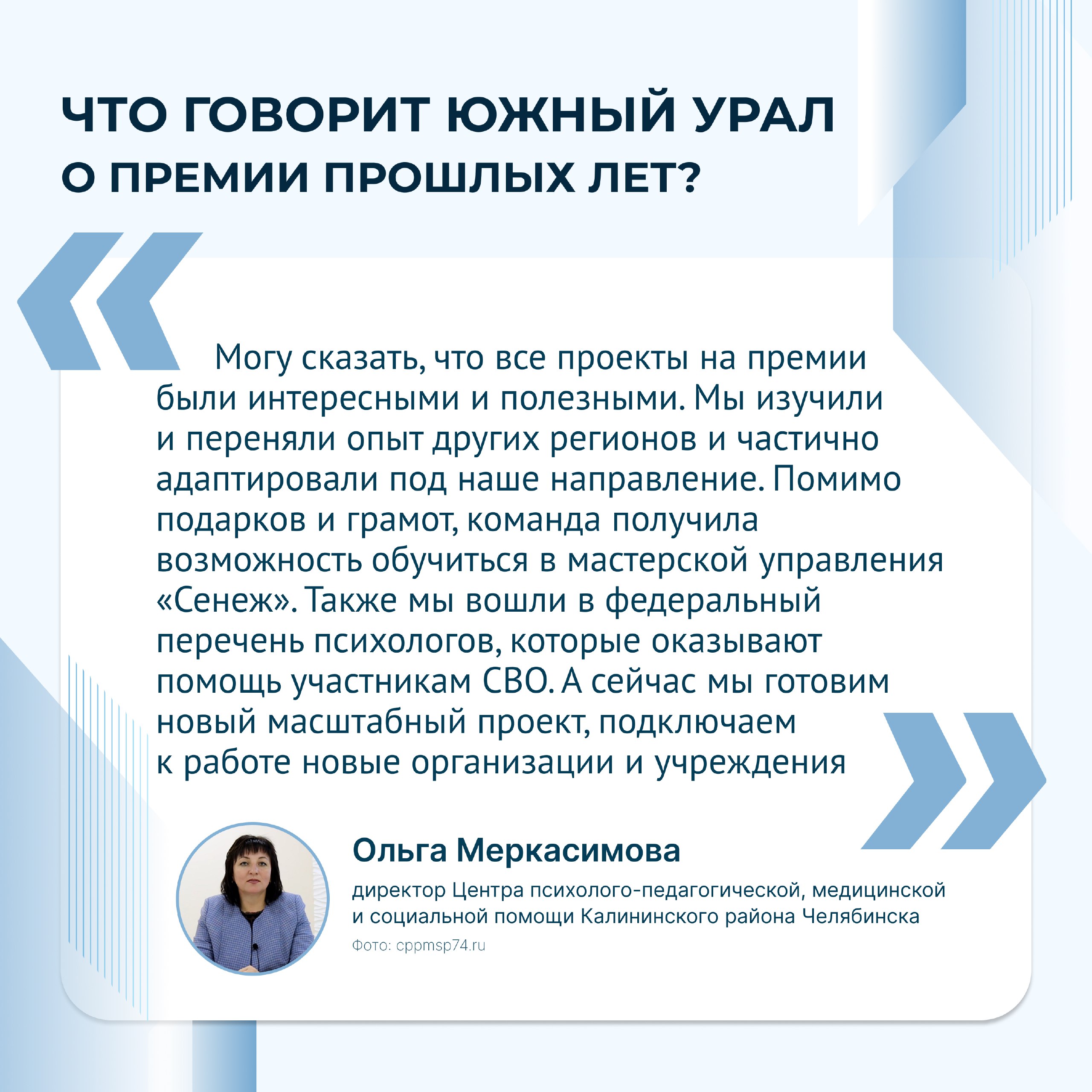 В прошлом году от Челябинской области было подано 360 заявок. Проект «Муниципальный ресурсный центр «Ресурсный центр медиации» стал лауреатом ТОП-100 номинантов премии в номинации «Благополучие семьи – приоритет государства».