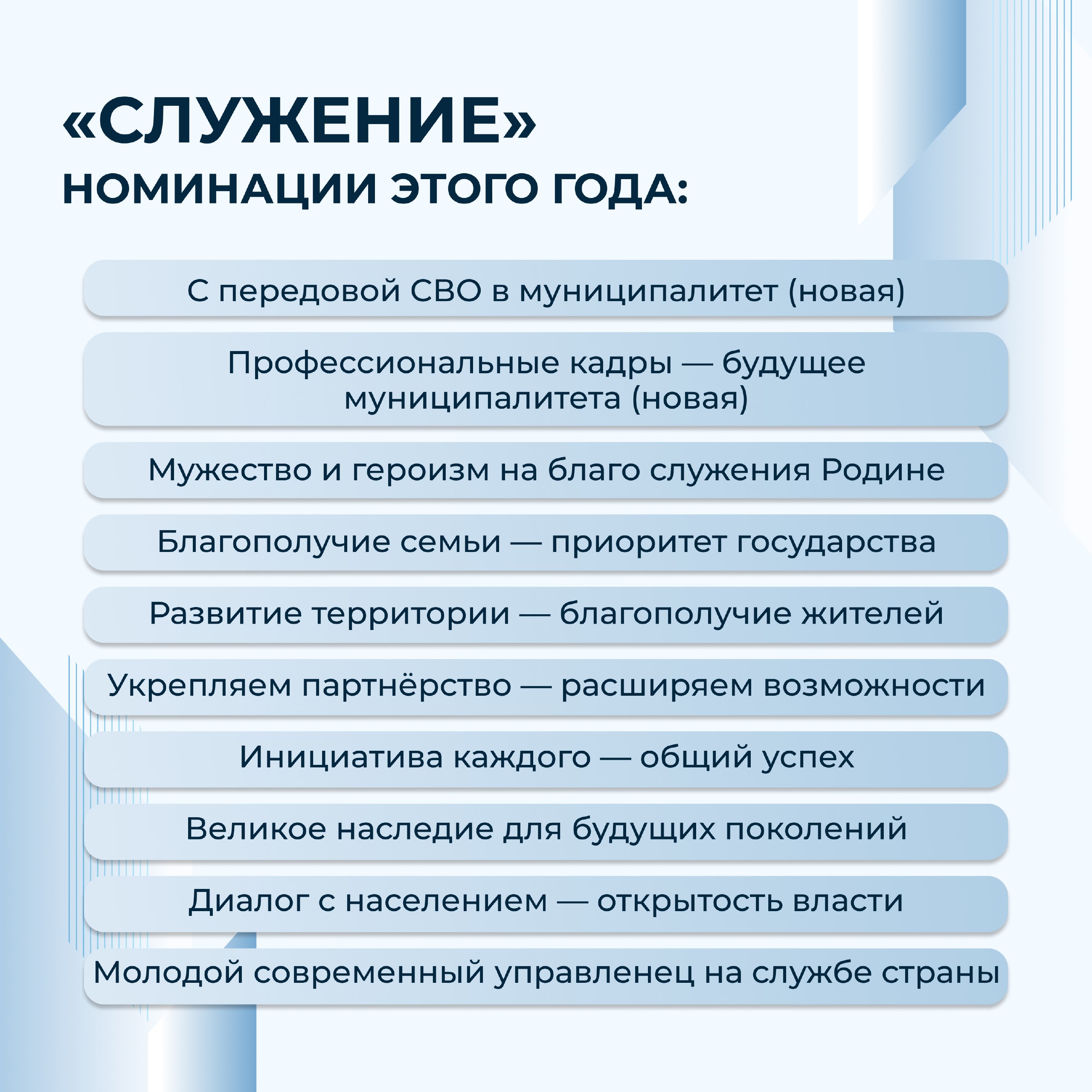 Премия «Служение» была учреждена Президентом России Владимиром Путиным, чтобы отмечать лучших представителей местной власти. Это те люди, чья работа реально меняет к лучшему жизнь в муниципалитетах.