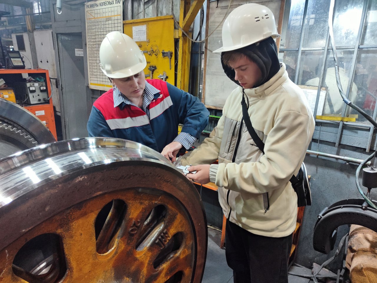 В колесном цехе для гостей была подготовлена расширенная программа. Старший мастер отдела технического контроля Дмитрий Фищев провел экскурсантов по всем участкам подразделения. Он объяснил, какие этапы проходит колесная пара от входного контроля до приемочного. В последнем студенты даже приняли участие. Мастер ОТК Ирина Филиппова показала на примере готовой колесной пары электровоза ВЛ-10 какими инструментами и как правильно делать измерения. После чего учащиеся сами попробовали произвести замеры ширины и толщины, а также резьбы торца оси и глубины отверстий.
