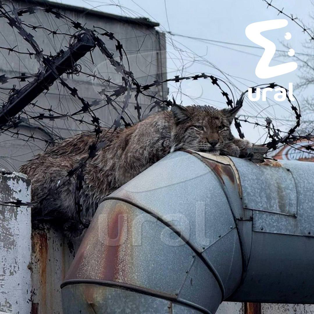 Рысь застряла в колючей проволоке в Челябинске.