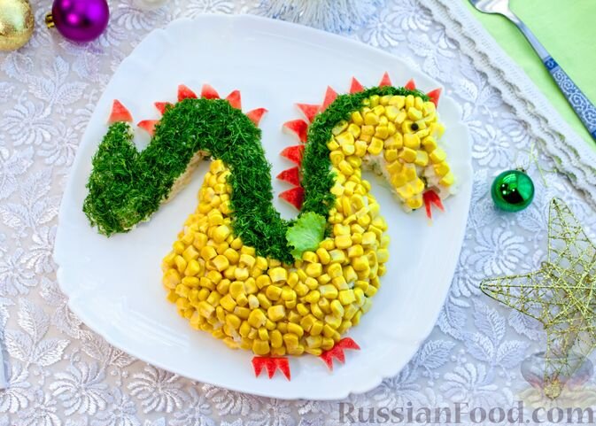 - Крабовый салат «Дракон»: Этот салат не только вкусный, но и оригинальный. Крабовые палочки отлично сочетаются с сладким яблоком и соленым сыром, придавая блюду нежный вкус и аппетитный внешний вид, оформленный в виде дракона.