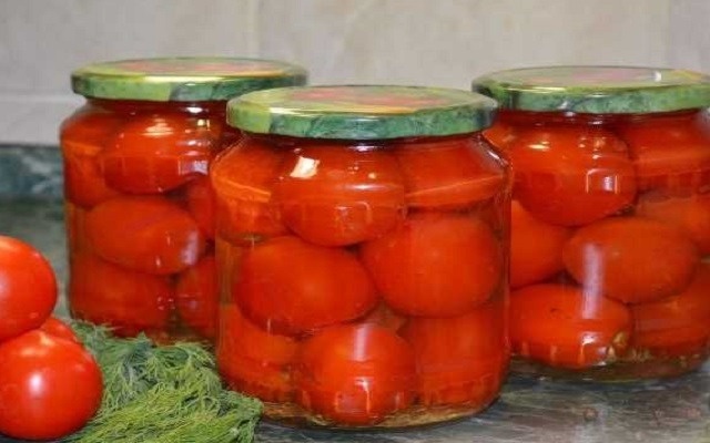Для начала на дно стерилизованных банок выкладываются все ароматные ингредиенты. Затем помидоры укладываются плотно, а сверху заливаются кипятком на 10 минут. После чего вода сливается, добавляется сахар и соль, и вновь вскипят это в кастрюле. Напоследок оставшиеся ингредиенты добавляются, банки закатываются и оставляются остывать под теплым покрывалом.