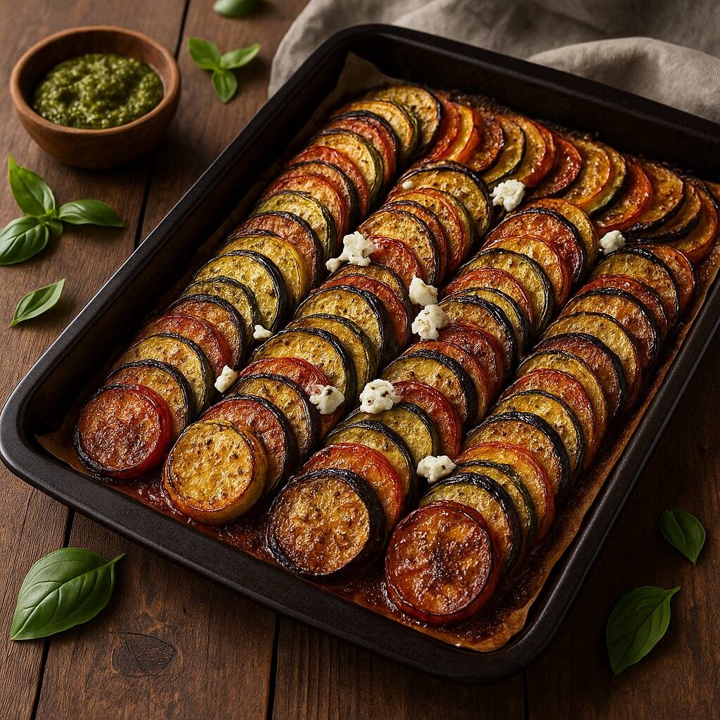 Готовые овощи выложить в глубокую тарелку, посыпать фетой и добавить немного песто. Можно украсить свежими травами по вкусу.