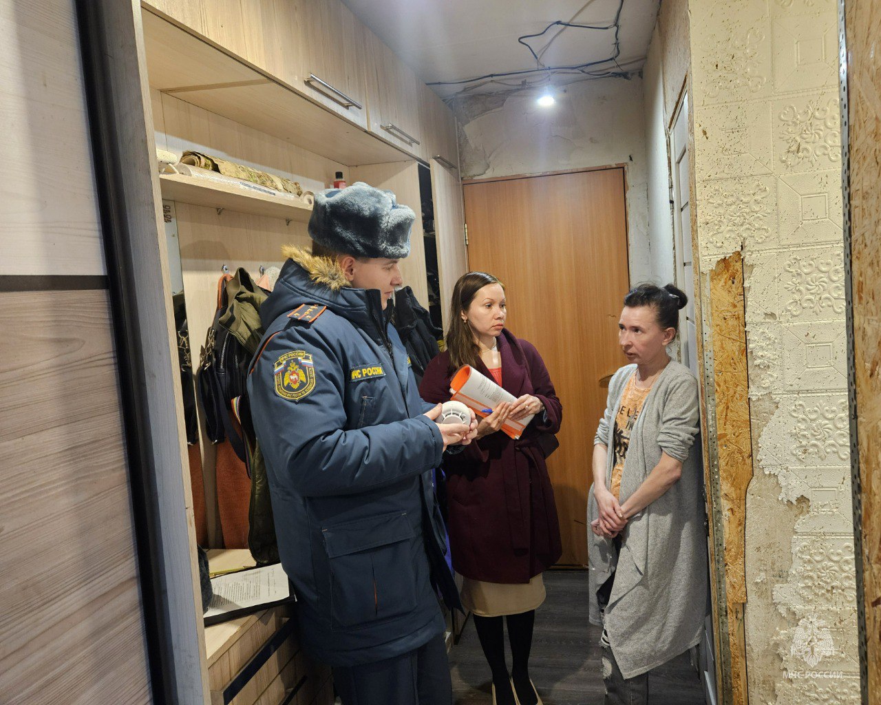 Чтобы защитить семьи от возможных возгораний, специалисты МЧС устанавливают в их домах автономные пожарные извещатели и объясняют, как они работают.