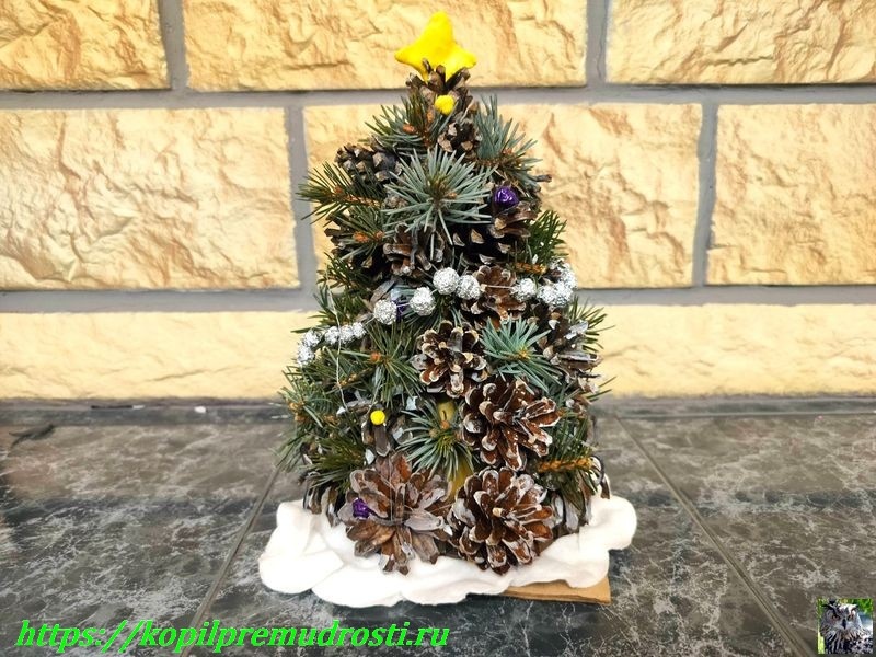 Для начала следует вырезать квадрат из толстого картона, который послужит основой для елки. Его размер может варьироваться в зависимости от желаемой высоты изделия. Затем из тонкого цветного картона создается конус, который будет формировать верхушку. Конус обклеивается шишками, начиная с самых крупных, и так до верха.