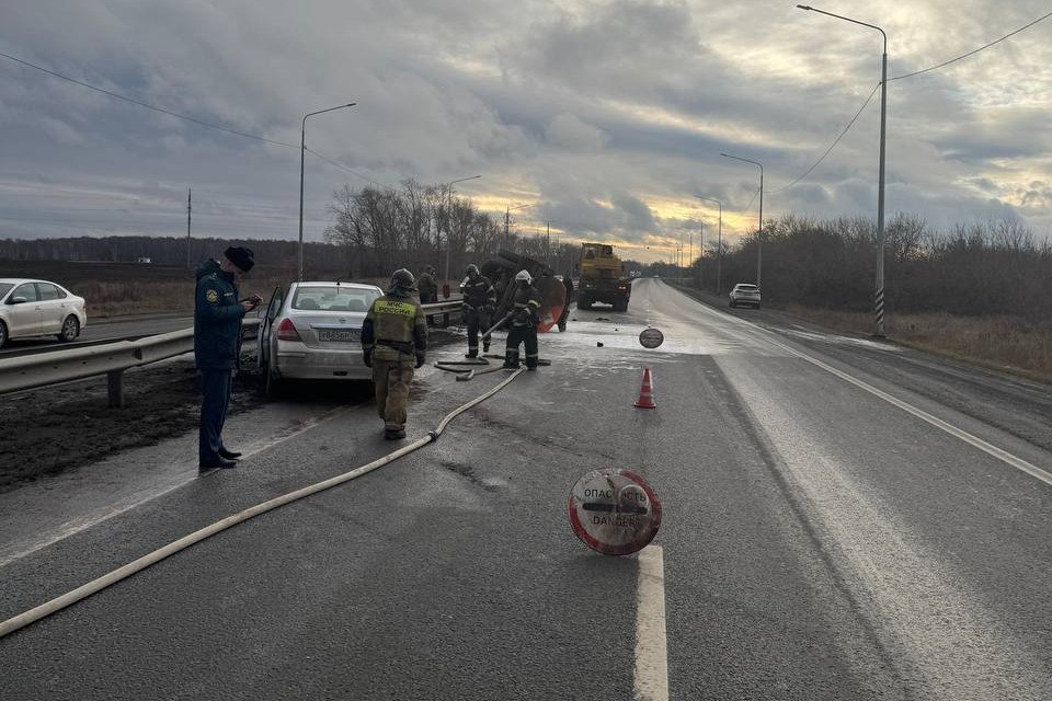 По предварительной информации, 43-летний водитель бензовоза не справился с управлением и врезался в ехавший рядом Nissan Tiida под управлением 64-летнего мужчины. После столкновения цистерна опрокинулась, произошел разлив топлива.