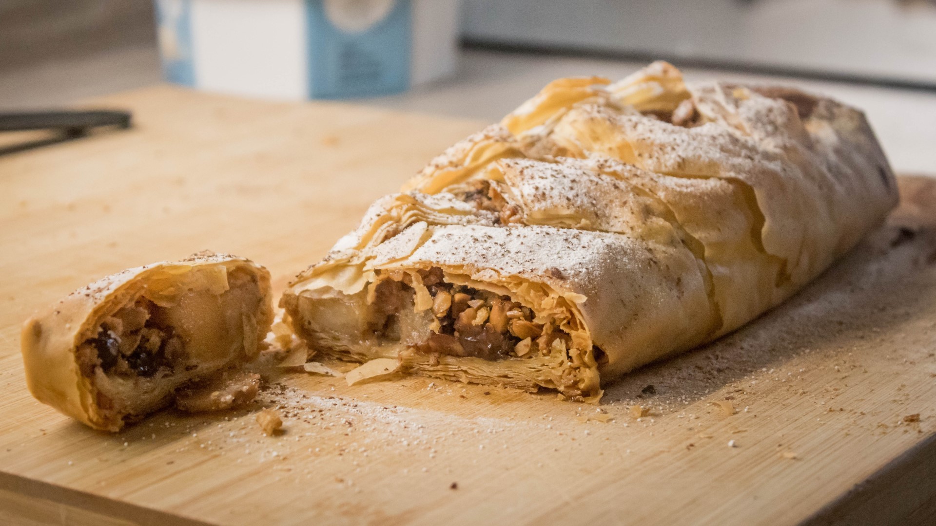 Перед подачей штрудель необходимо разрезать. Можно посыпать его сахарным песком или полить взбитыми сливками, делится рецептом Дзен-канал «Кулинарные истории».