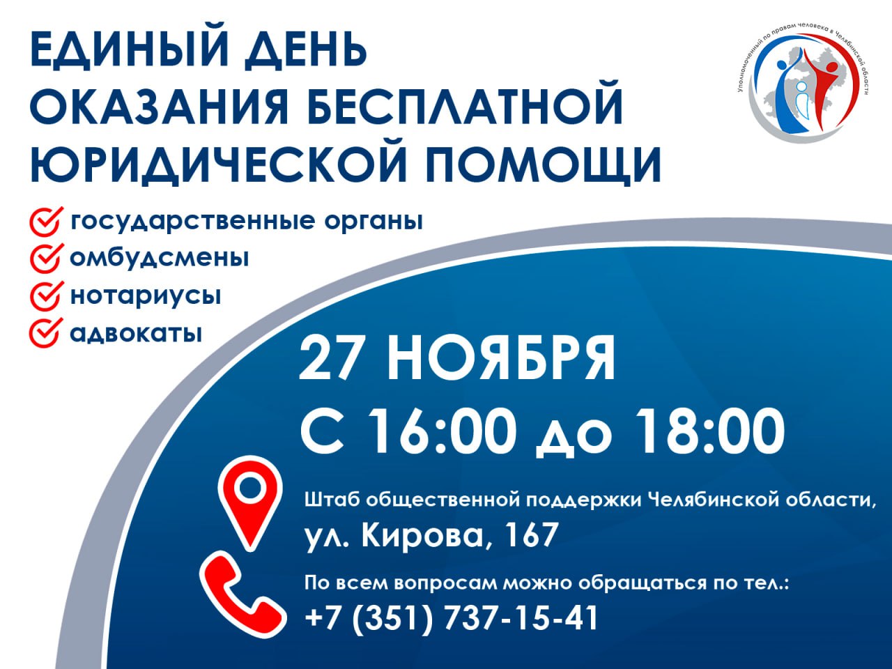 По всем дополнительным вопросам можно обратиться по телефону: 8 (351) 737-15-41 (приемная Уполномоченного по правам человека в Челябинской области).