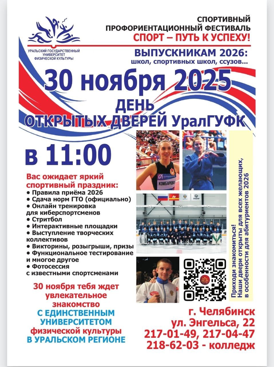 День открытых дверей состоится 30 ноября 2025 года в 11:00 в учебно-тренировочном комплексе «Манеж» Уральского государственного университета физической культуры по адресу: г. Челябинск, ул. Энгельса, 22.