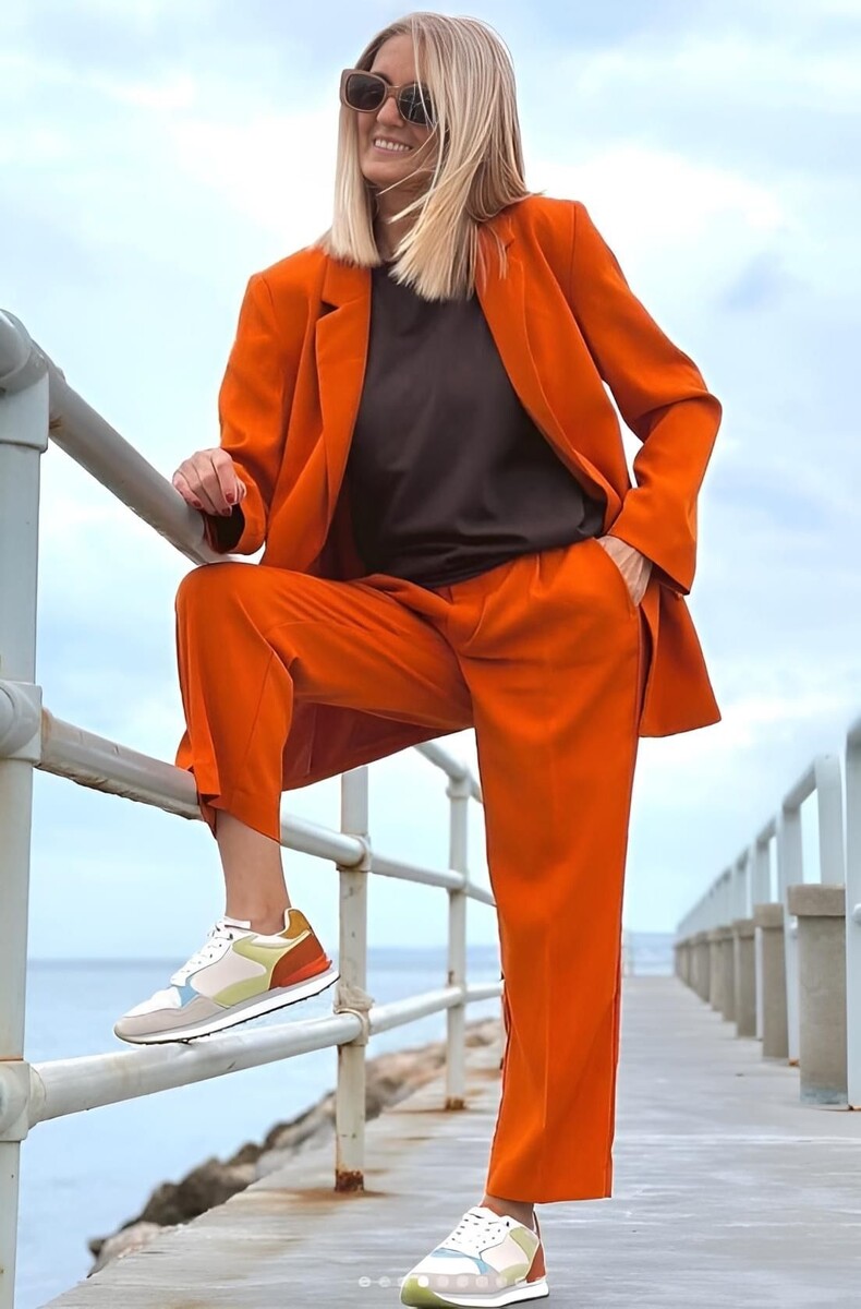 1. Насыщенный терракотовый костюм: классические брюки со стрелками в сочетании с строгим жакетом оверсайз создают стильный ансамбль. Дополните его черной шелковой блузой и белыми кроссовками; такой комплект подчеркивает индивидуальность и современный вкус женщины.