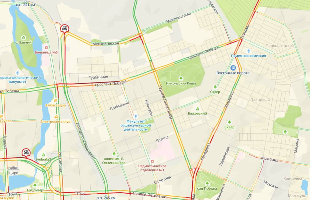 Стоит весь центр, Северок и ЧТЗ. Удивительно, но на въезде в Металлургический район пока не все так страшно.