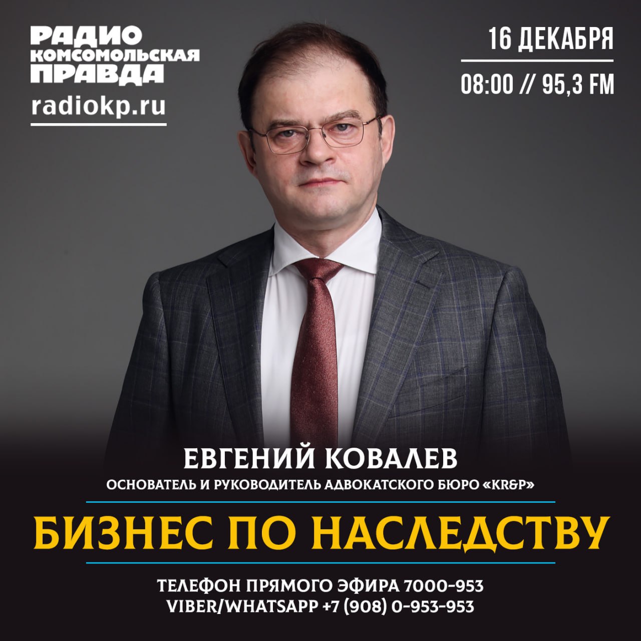 Многие основатели крупного бизнеса в России сейчас переживают период старения и выгорания. Время работает против них, а значит, надо думать над передачей своих активов детям, вторым половинкам и т.д. Но какие риски их здесь поджидают? Готовы ли сами наследники взять на себя это бремя и успешно развивать его? Сам бизнес это личный проект или проект семьи? Во вторник, 16 декабря, в 8:00 гость программы "Бизнес по наследству" на радио "Комсомольская правда" (95.3FM) – основатель и руководитель адвокатского бюро «KR&P» Евгений КОВАЛЁВ