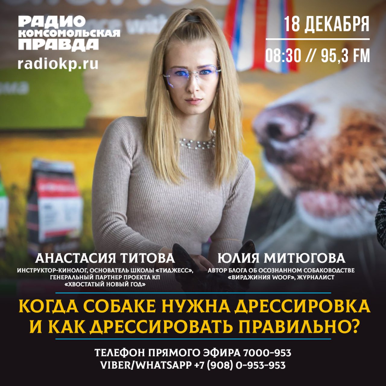 Дрессировка собак отличается от обычного воспитания и обучения командам. Однако многие задаются вопросом: не является ли это насилием над животным? Также узнаем, что такое хендлинг, какие породы лучше поддаются дрессировке, возможно ли освоить трюки в домашних условиях и на обычной площадке для выгула? А еще расскажем о классном новогоднем конкурсе "Комсомолки", который понравится всем, хозяевам домашних питомцев. В четверг, 18 декабря, в 8:30 гости программы “Жизнь замечательных животных” на радио "Комсомольская правда" (95.3FM) - генеральный партнер проекта «Хвостатый Новый год», инструктор-кинолог, основатель школы «ТиДжесс» Анастасия ТИТОВА и автор блога об осознанном собаководстве «Вирджиния Woof», журналист КП-Челябинск Юлия МИТЮГОВА
