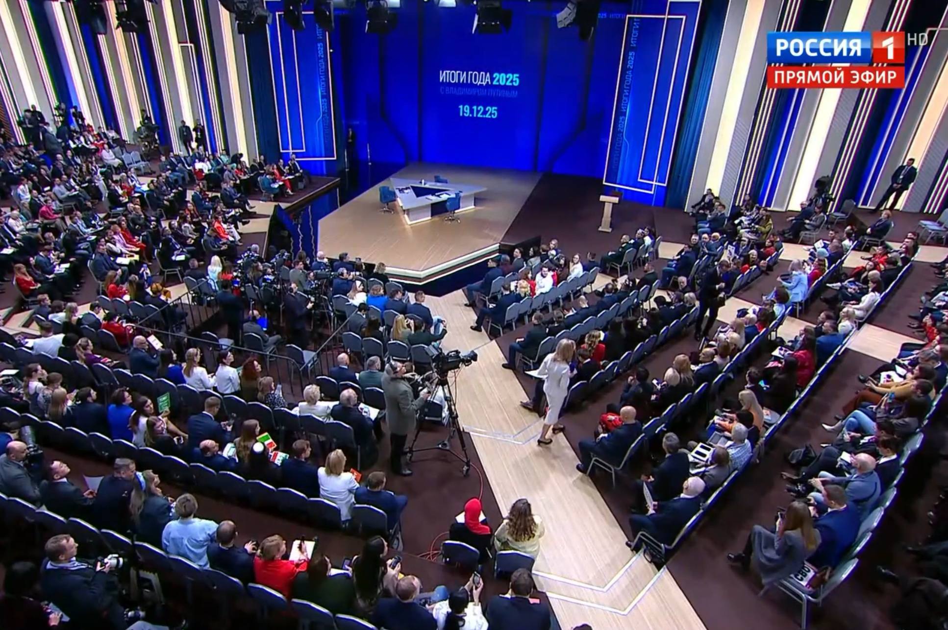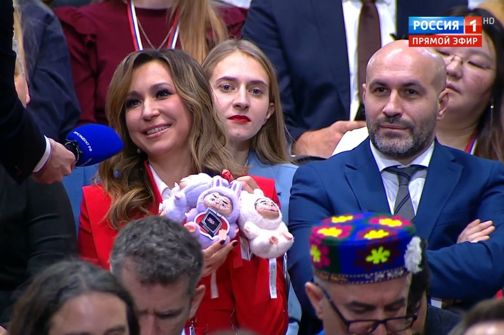 Прямой эфир итогов года уже стартовал, правда, пока без Владимира Путина. Ведущие общаются с залом. Одна из журналисток пришла с куклами лабубу, у которых лица мировых политиков.