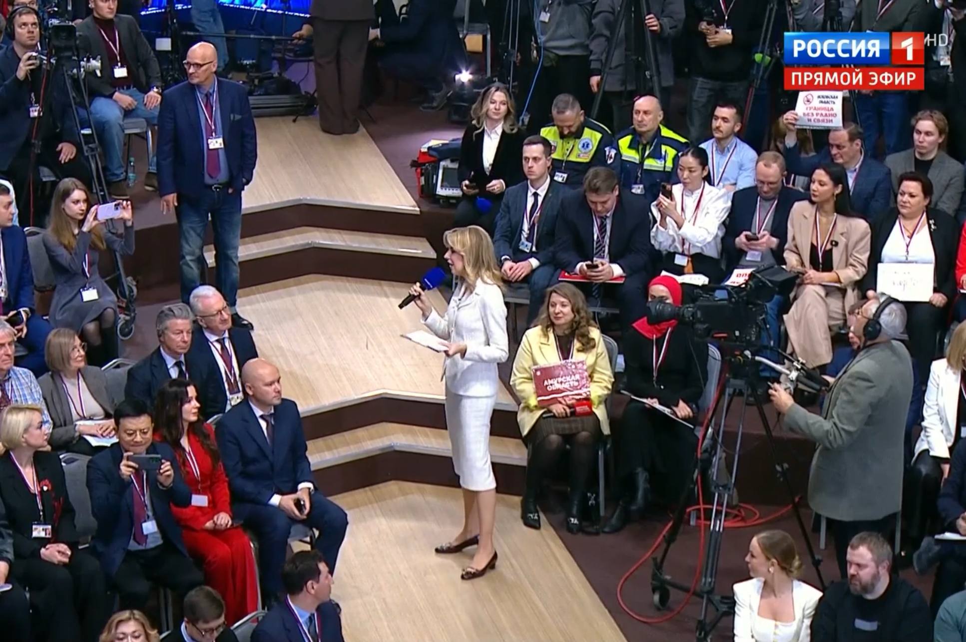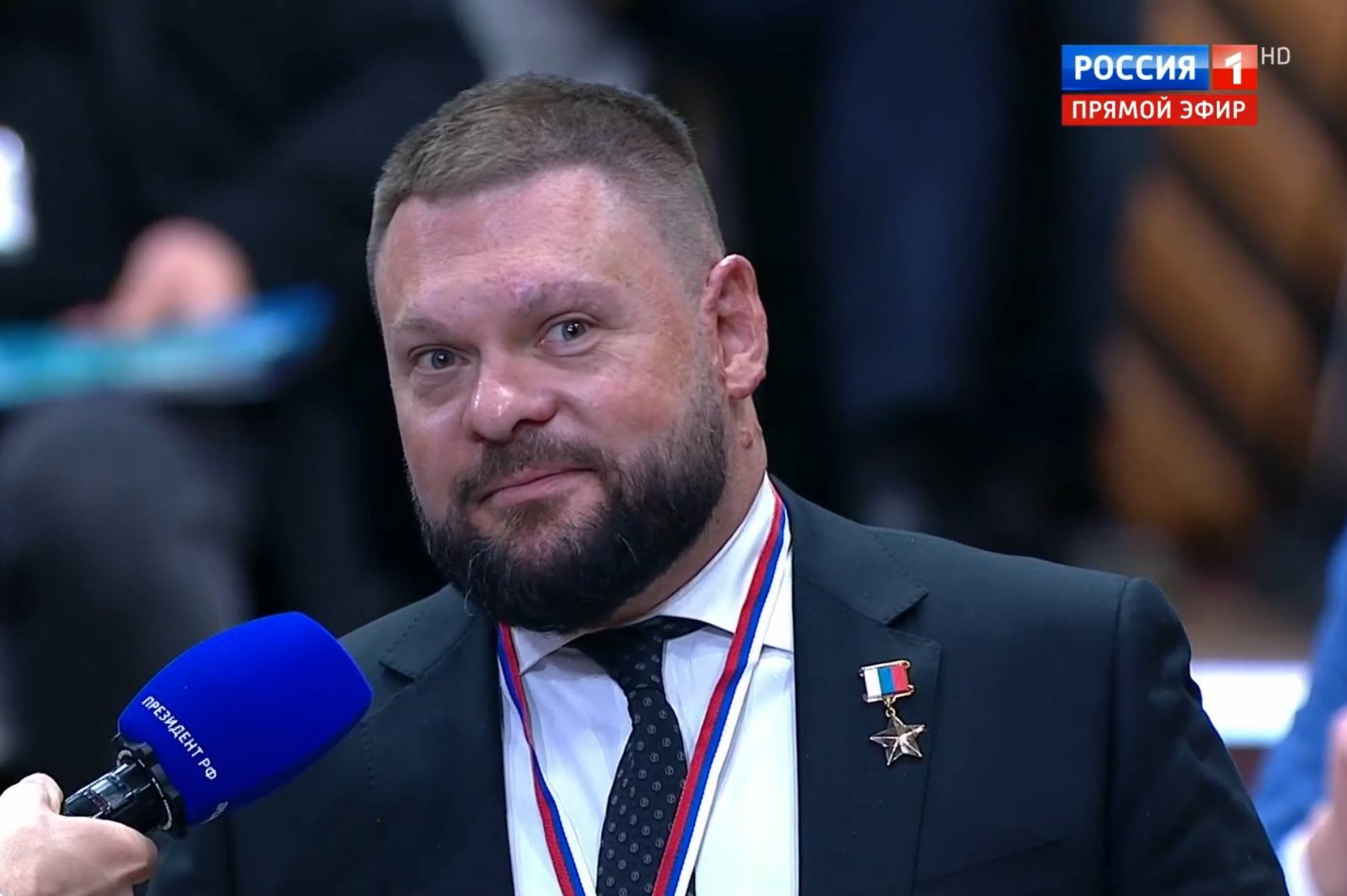 В зале единственный журналист со звездой Героя России Евгений Поддубный. Уверены, что свой вопрос президенту он точно задаст.