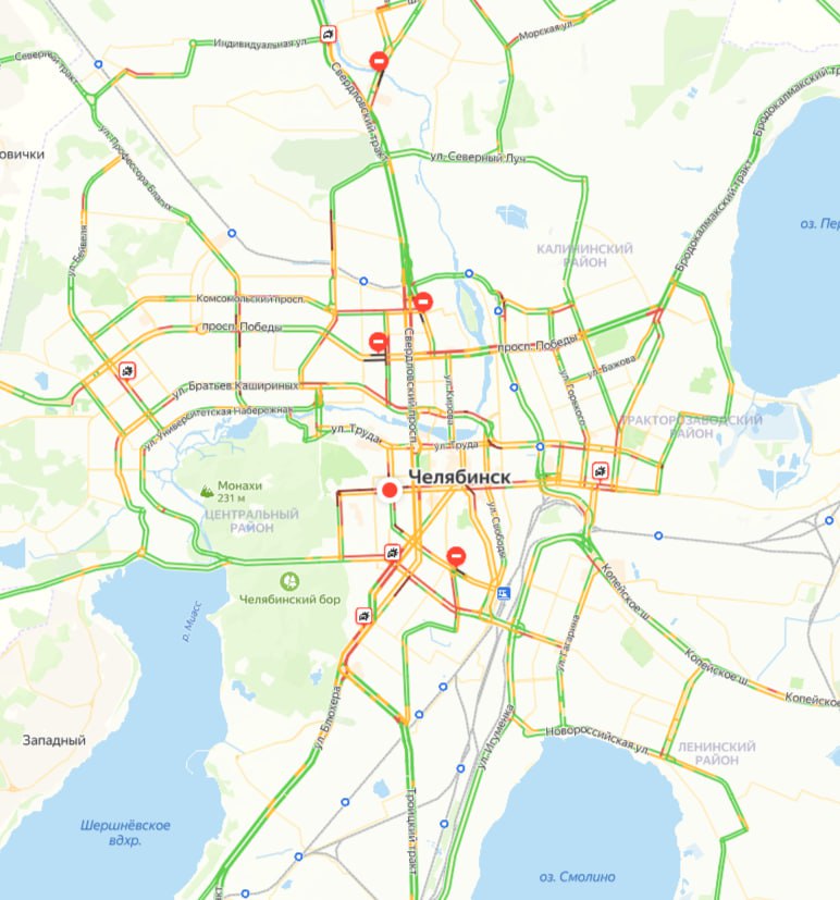 Отвлечемся от прямой линии. В Челябинске пробки уже 8 баллов, чуть раньше было даже 9. Мы проследили: дороги и тротуары чистились.