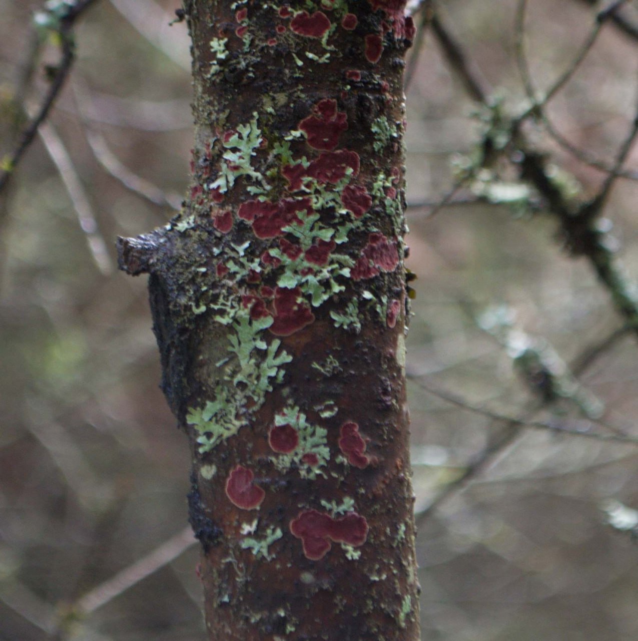 Пятна винно-красного цвета плотно прикрепляются к древесине. А если их много — сливаются в большое красное пятно и могут охватить до двух метров ствола.