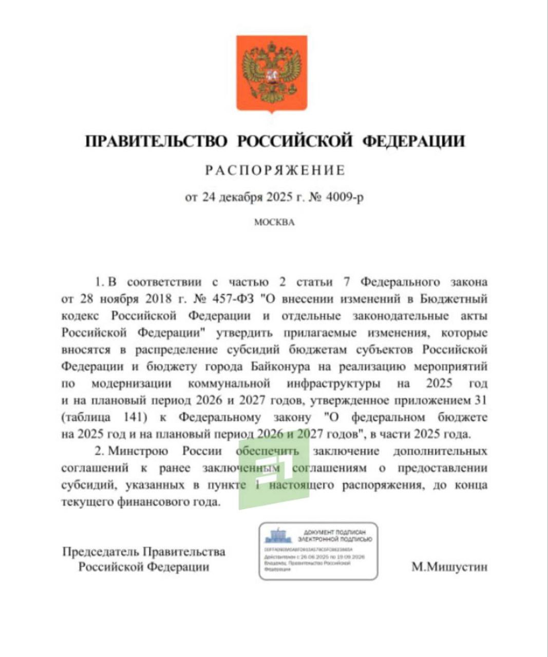 Соответствующее распоряжение подписал премьер-министр Михаил Мишустин.