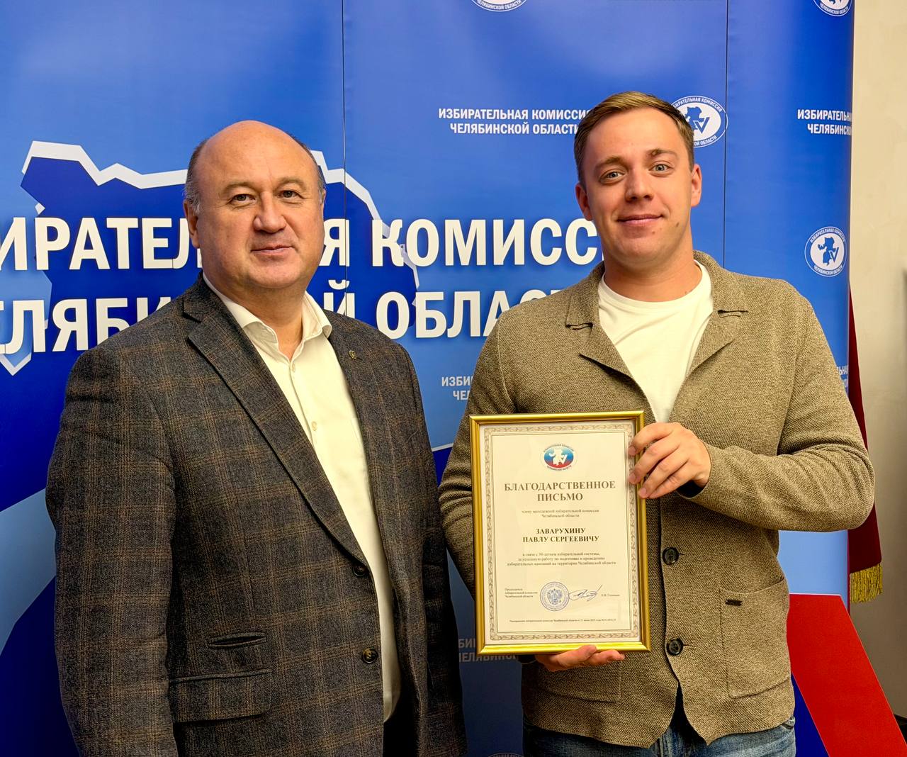 Председатель облизбиркома Евгений Голицын вручил благодарственные письма избиркома секретарю МИК Эльвире Истамгуловой и члену комиссии Павлу Заварухину. Евгений Викторович поблагодарил всю команду за плодотворную работу и пожелал успехов в 2026 году