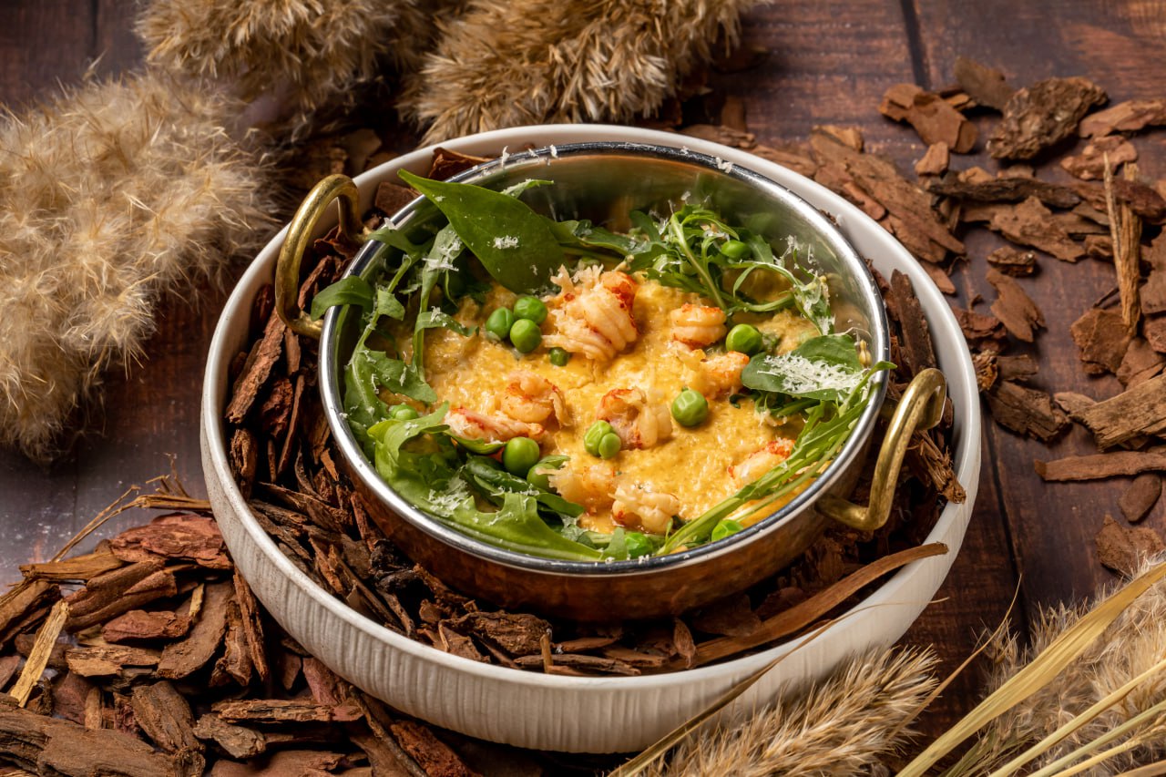 Горячее называется «Золото Караганки» – это пшенная каша с нежными раковыми шейками, добытыми в чистых водах реки Большой Караганки. Это блюдо сравнивают с самой аркаимской крепостью: теплое, сытное и надежное.