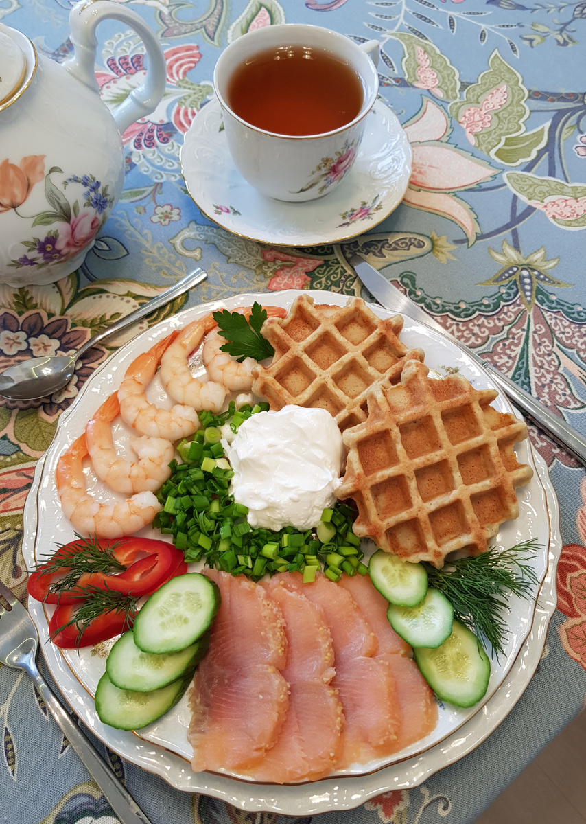 Готовые вафли можно подавать с украшающей сметаной, зелёным Луком, разнообразными свежими овощами, а также соленой семгой и вареными креветками. Это не просто завтрак, а настоящая кулинарная симфония, которую стоит попробовать!