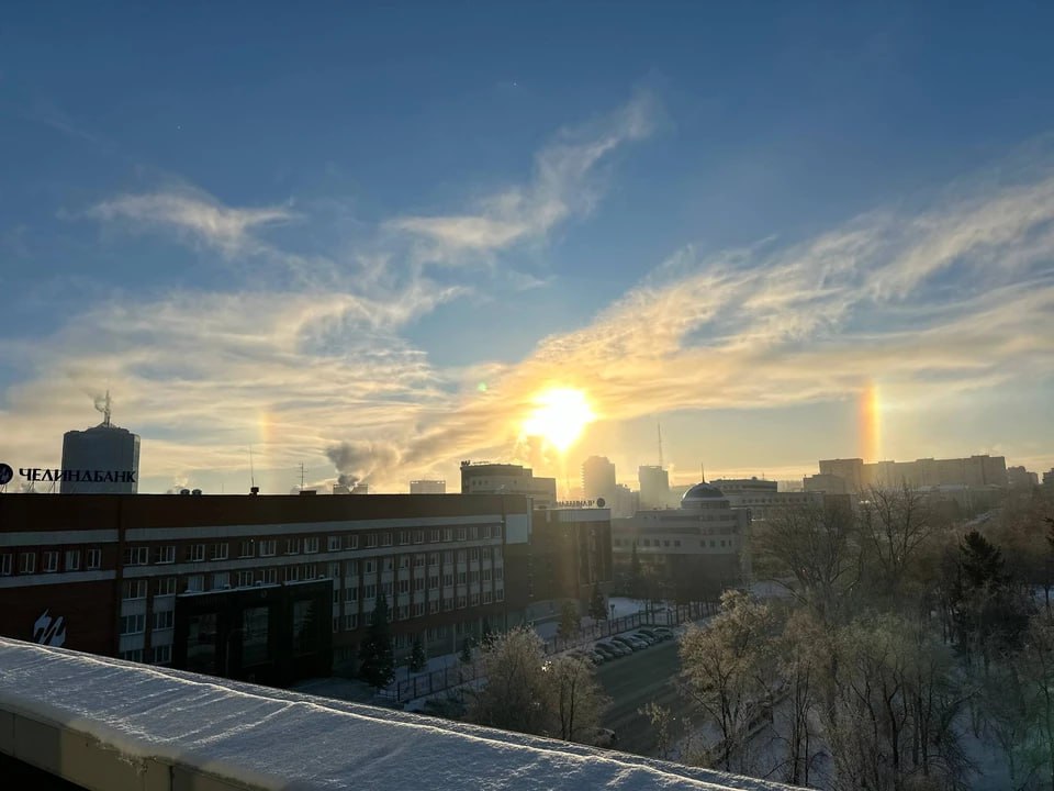 Жители Челябинска утром 14 января стали свидетелями редкого оптического явления. В небе над городом возникло гало. Вокруг солнца заметен был ореол, а слева и справа возникли иллюзорные мини-светила.