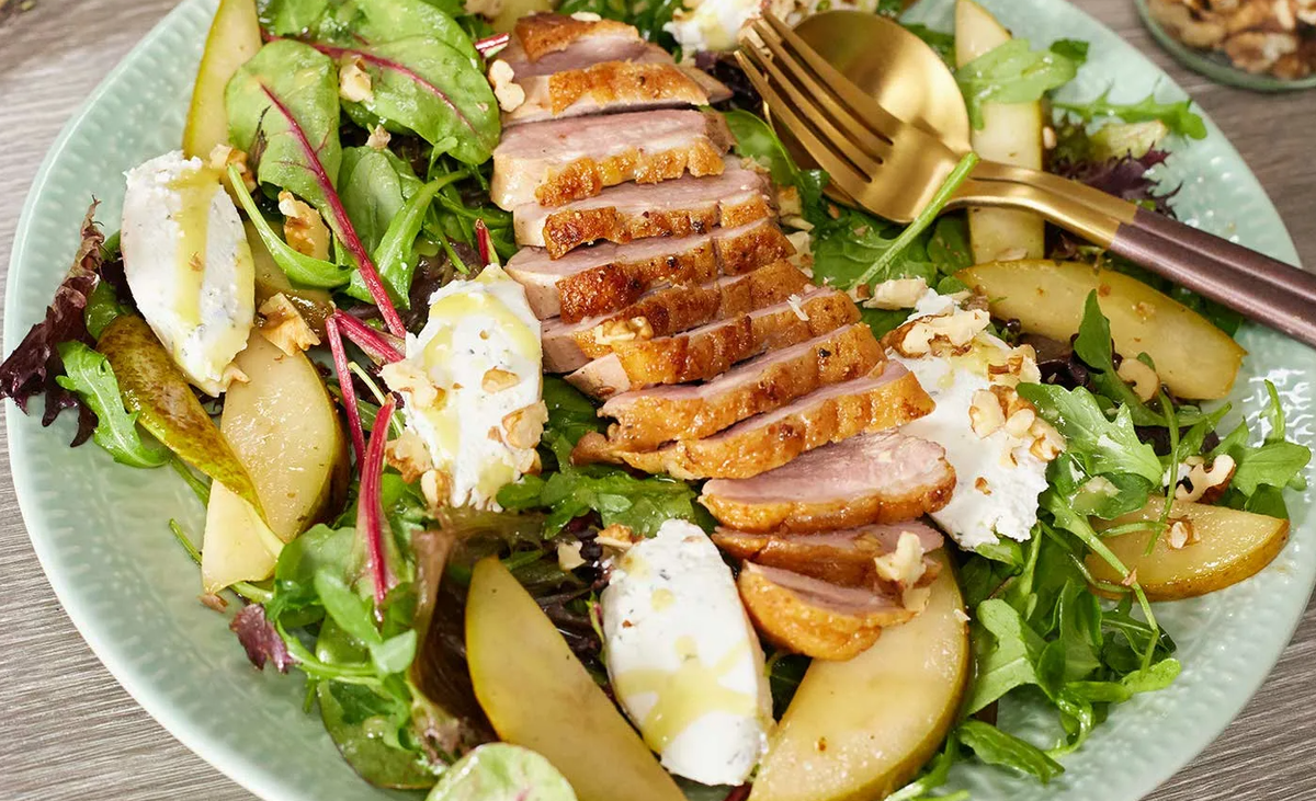 Салат с утиной грудкой, грушей, нежным сыром и рукколой — это истинное произведение кулинарного искусства, которое украсит любой праздничный стол. Он не только выглядит эффектно, но и удивляет гармонией вкусов: сочная утка, сладкие груши, пикантный сыр и свежая руккола, создают взрыв ощущений, который приятно удивит ваших гостей.