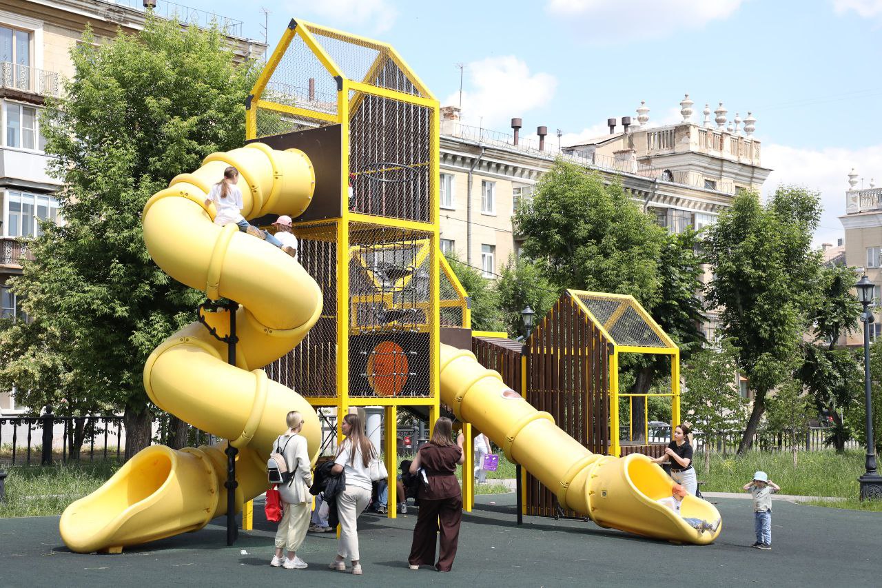 На месте старой детской площадки появился большой игровой кластер с горками и качелями.