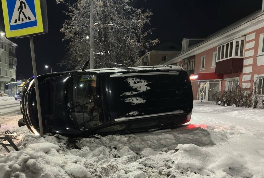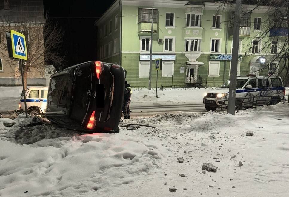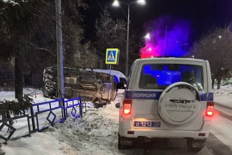 В Чебаркуле ночью инспекторы ГАИ пытались остановить лихача. В итоге автомобиль врезался в дорожное ограждение и завалился на бок.