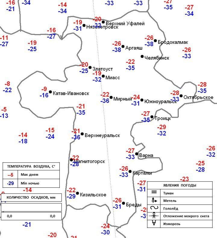 Такую температуру зафиксировали в Бродокалмаке и Аргаяше. В Верхнеуральске и Мирном было -36 градусов, в Челябинске и Троицке – около -35.
