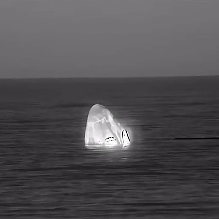 Корабль Crew Dragon с челябинским астронавтом и его коллегами по МКС из NASA благополучно приводнился. На видео, опубликованном госкорпорацией, он безмятежно дрейфует на волнах близ Калифорнии.