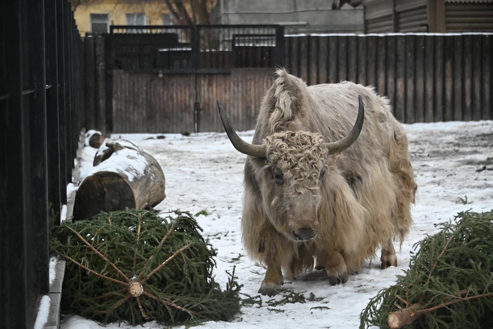 Снять игрушки и мишуру: новогодние елки станут лакомством для животных в зоопарке