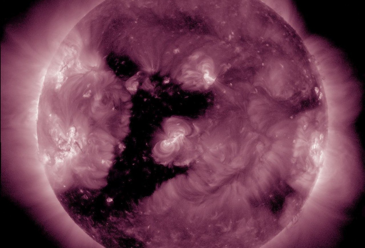 Огромная корональная дыра необычной формы образовалась на Солнце. Она напоминает перевернутую цифру "1" высотой около 1 млн км.