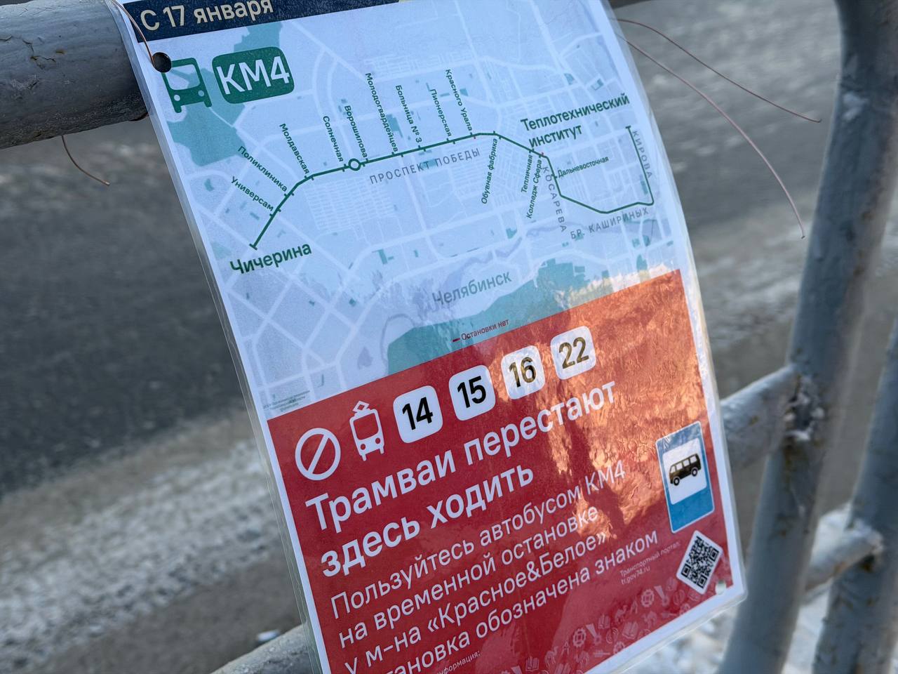 Для пассажиров организован компенсационный автобусный маршрут по проспекту Победы, улицам Косарева, Братьев Кашириных и Кирова.