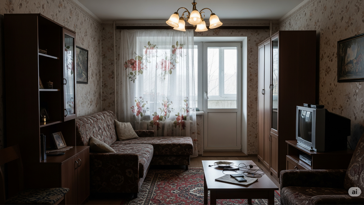 Переполненные полки, старые ковры и громоздкая бытовая техника создают впечатление хаоса. Пыль на старых вещах и возрастные недостатки теряют внешний вид комнаты.