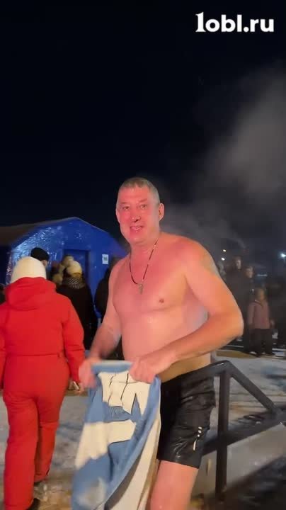 Мужчина с полотенцем известного бренда говорит, что окунается каждый год.