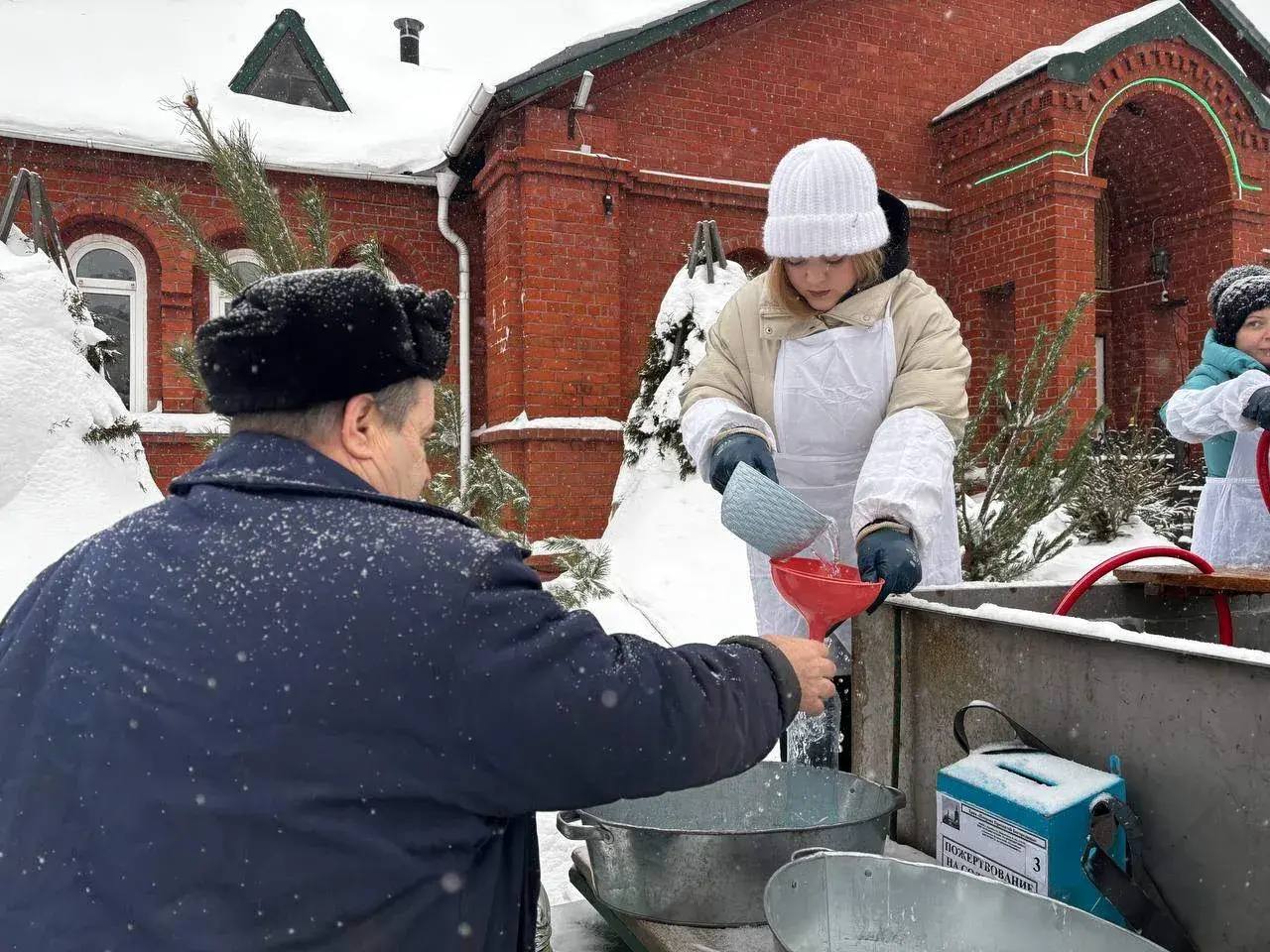 Более 30 волонтеров и активистов общественных молодежных организаций городского округа помогают в разливе святой воды, над которой был совершен особый чин Великого освящения. Также оказывают помощь в замене свечей, очистке подсвечников и работе в столовой.