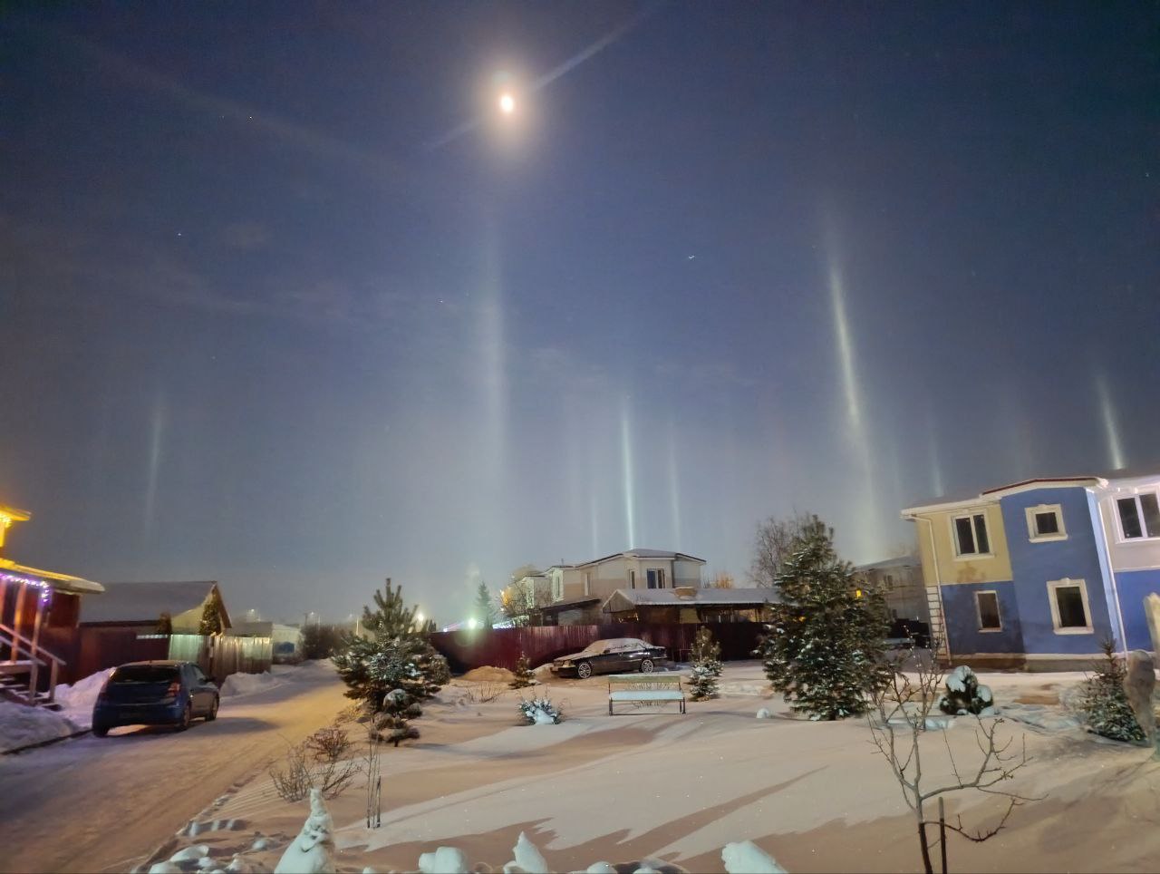 Световые столбы заметили челябинцы. Редкое оптическое явление появлятеся из-за кристалликов льда в воздухе. Они преломляют свет от фонарей и других источников отражаются, тянутся вверх и вниз ровной вертикальной полосой. Выглядит завораживающе