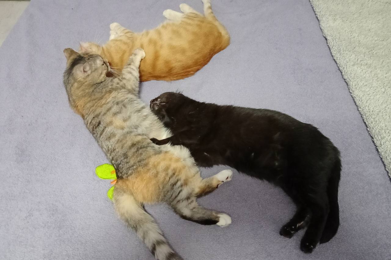 Уголька в семье приняли тепло. Он продолжает восстанавливаться: видит хорошо, активно играет, в шутку борется с другими котами и постепенно перестает бояться людей.