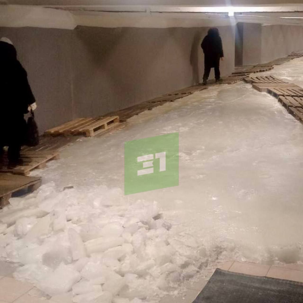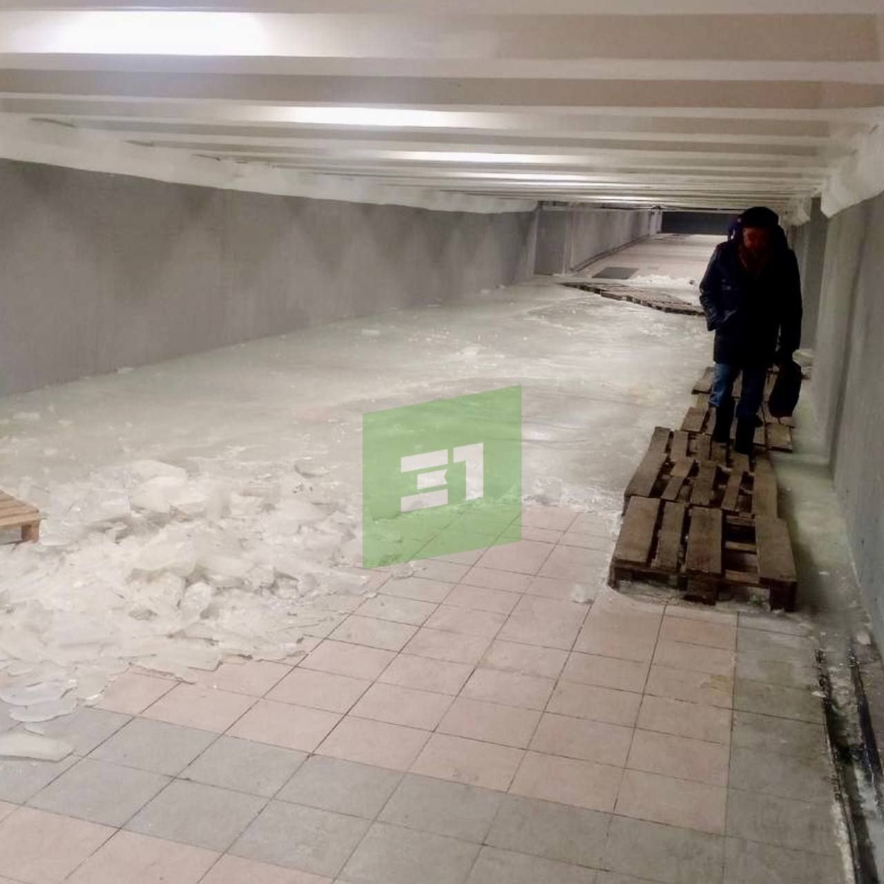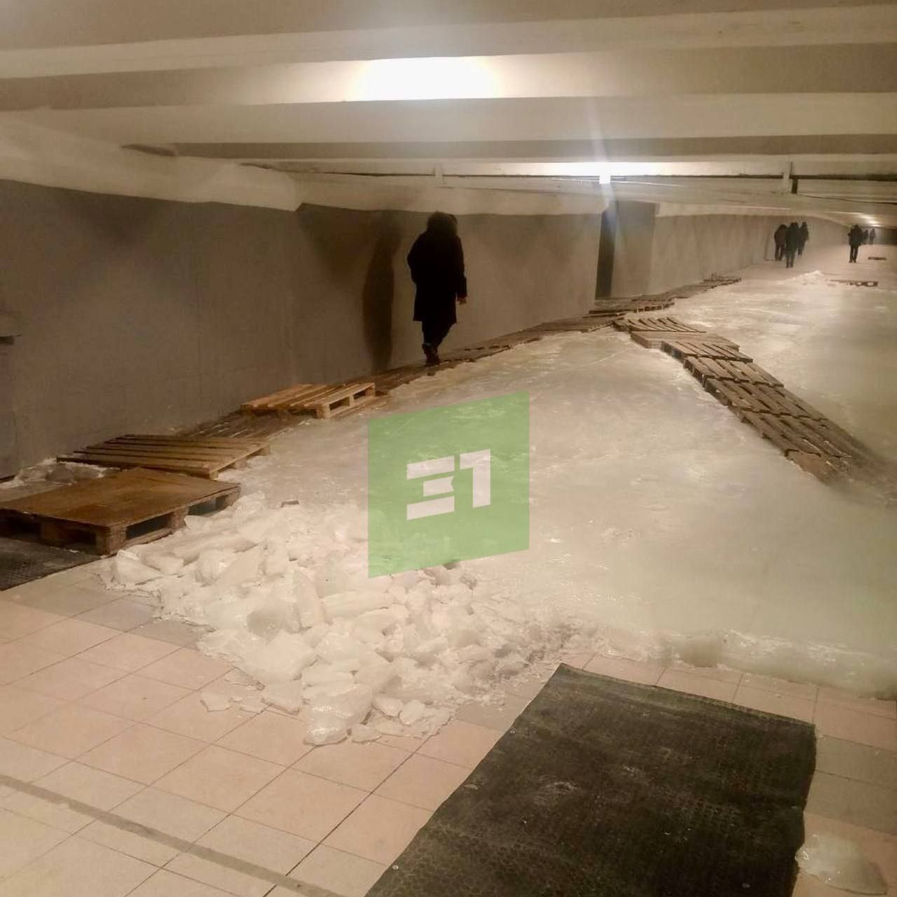 На Копейском шоссе затопило подземный переход. Теперь все покрылось льдом.