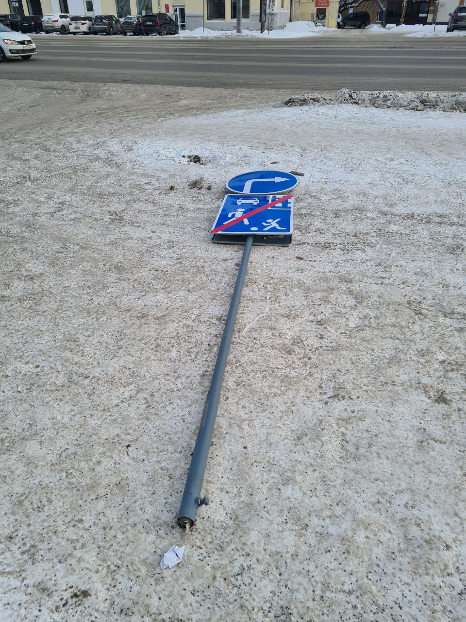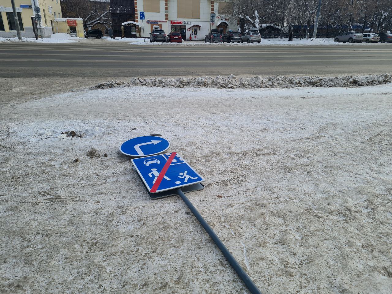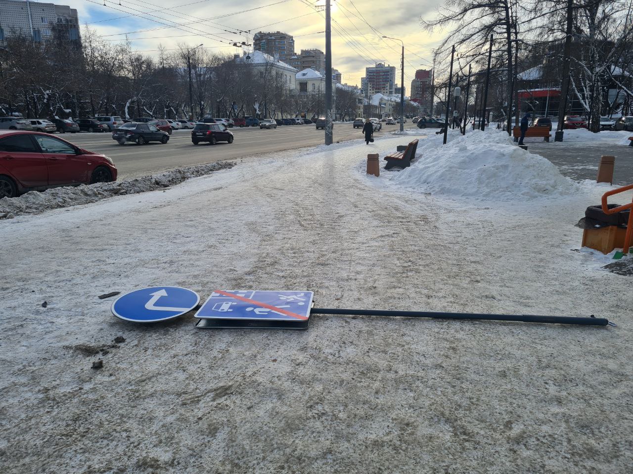 В центре Челябинска, напротив дома 41 по ул. Воровского на тротуаре валяется дорожный знак "Жилая зона"