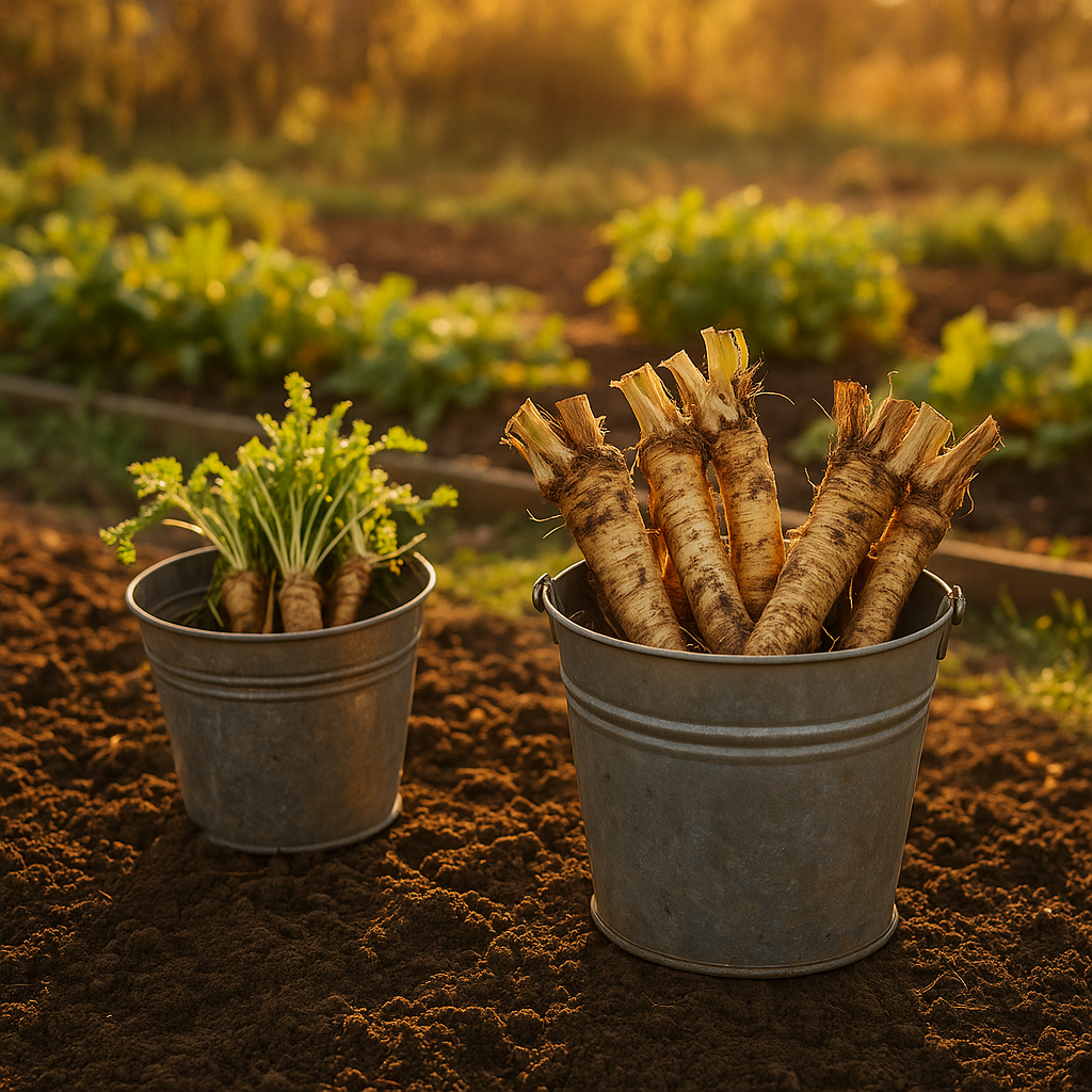 Выделяю хрену отдельный круг правил: ведро или бочка без дна, частично утопленное в землю, с опорой на 5–7 см над поверхностью. На дно — перегной и зола, сверху — корень длиной 20–25 см. Растение остаётся в рамках и удобнее копается позже.