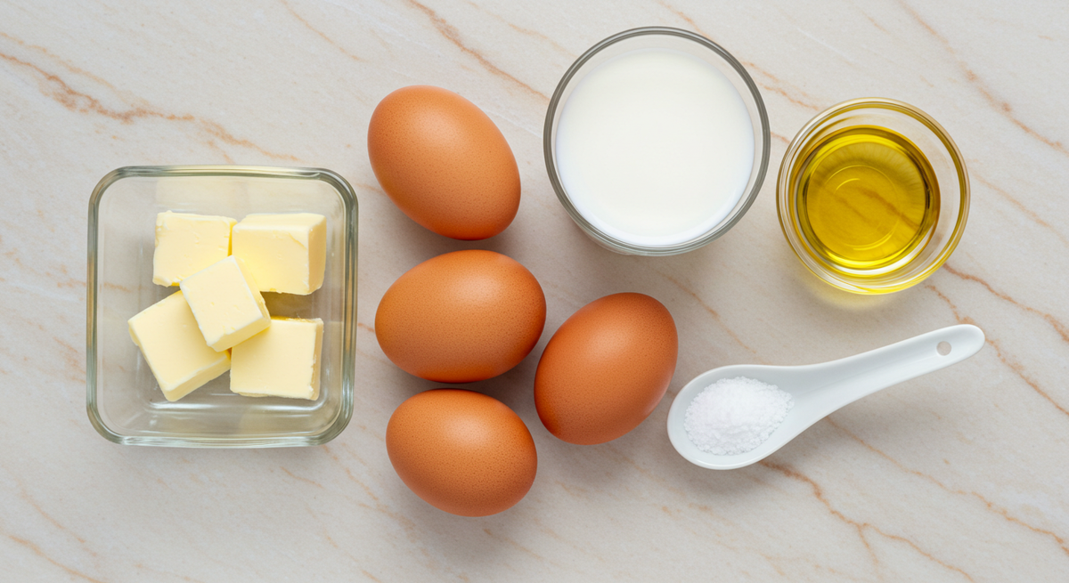 Ингредиенты на 4 порции: яйца комнатной температуры, молоко тёплое, сливочное и растительное масла, щепотка соли. Включите воображение и позвольте простоте работать на вкус и настроение.