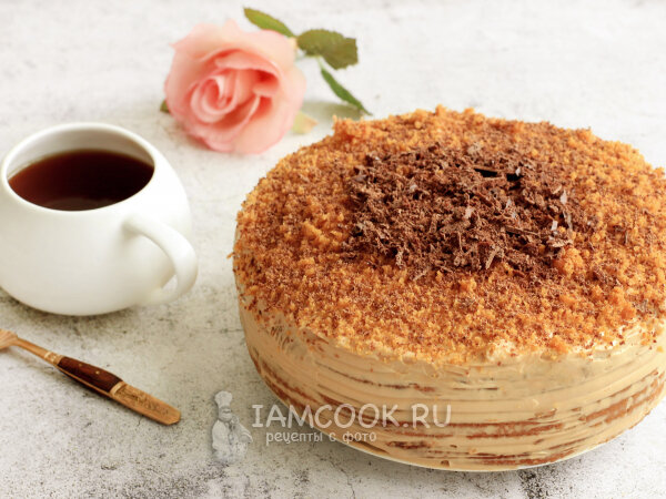 Сметана соединяется со сгущёнкой до нужной консистенции; верхнюю часть бисквита снимают и раскрошивают, чтобы получить ароматную крошку для обсыпки. Торт собирают в три тонких слоя, каждый щедро пропитывают кремом, боковые стороны и верх — кремом, а на финал посыпают крошкой; можно украсить шоколадной стружкой по желанию.