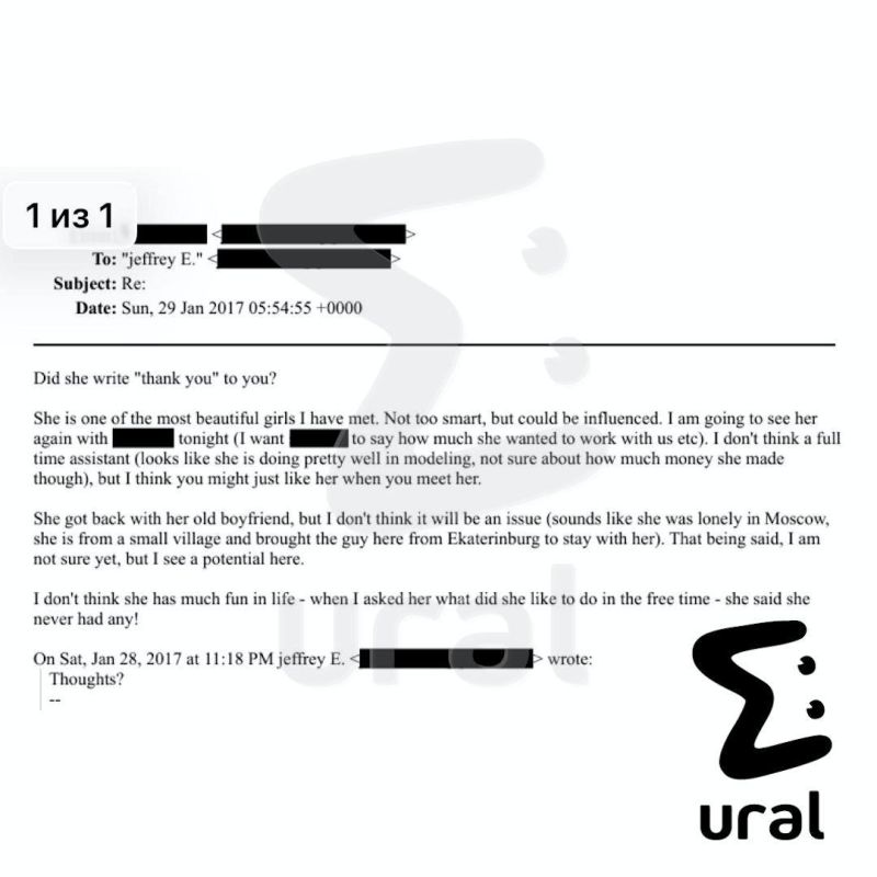 Судя по переписке помощников финансиста, во время визитов в уральскую столицу они жили в отелях Park Inn by Radisson и Hyatt, билеты туда-обратно оформляла менеджер American Express Наталья Молоткова. В письмах 2017 года Эпштейну советовали екатеринбурженку — её называли "одной из самых красивых". Отобранные кандидатки часто летали маршрутом Екатеринбург — Москва — Париж. Схожие истории всплыли и в Челябинске. Некая Ирина рассказывала Эпштейну о 23-летней девушке, отдельно упоминались челябинка Оксана и встреча с жительницей Озёрска.