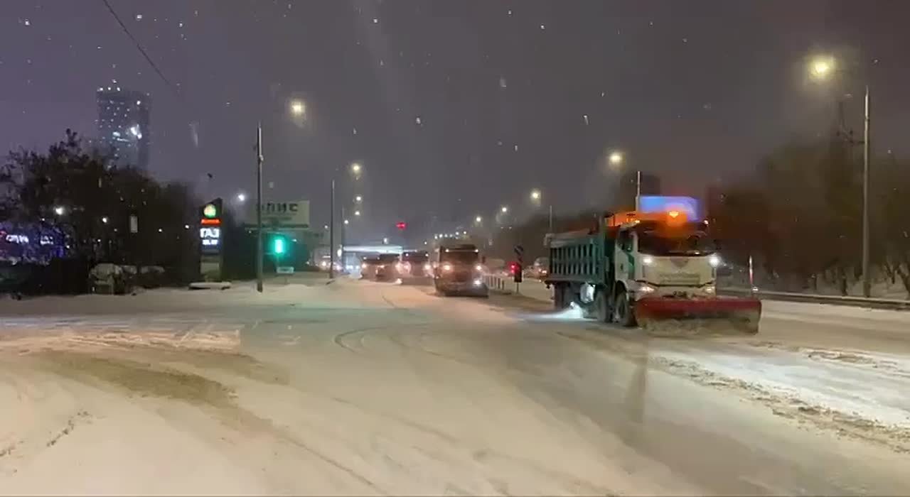 Минувшей ночью на улицах города работали 194 единицы техники и 185 рабочих. Они очищали проезжую часть, парковочные карманы, остановки и тротуары, формируя снежные валы для вывоза.